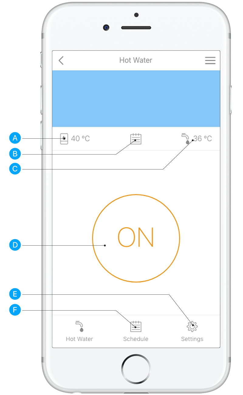 You can see the Set Temperature for your hot water (A) (top left). You can also see the actual current temperature that is being used (C) (top right). In this screen you may notice that the current temperature is higher than the setpoint. The Set Temperature is the desired settled temperature for your hot water. Initially, the Boiler temperature will probably overshoot this, then under and then settle to the desired Set Temperature (E).