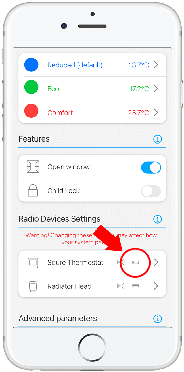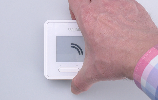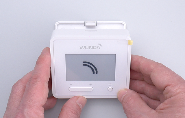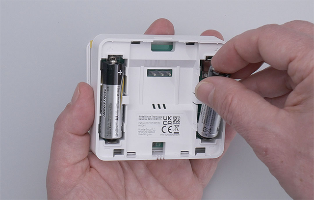 - Access the Square Thermostat's battery compartment by pressing the button situated on the top side and removing it from backplate.