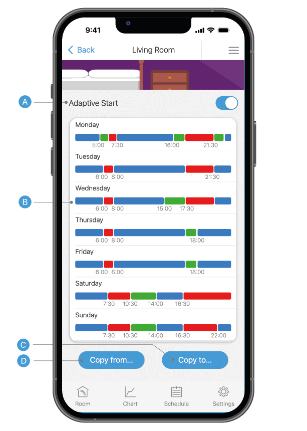 Top Tip - If your schedule is similar for all the rooms you regularly use, just simply set up one room’s 7-day schedule and then copy to the others. And then setup a schedule for a room you rarely use, (maybe it’s mostly ‘off) then copy that to the other rooms you rarely use as well. Then adjust as you go.