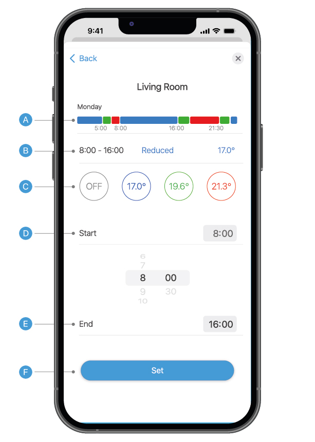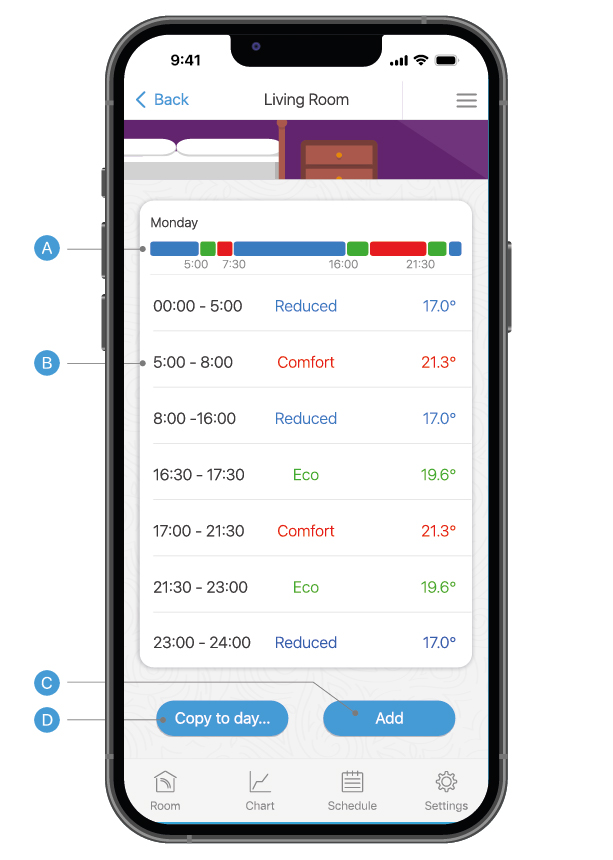 - Now select Add (C), and choose a preset temperature and a start and an end point for the heating period.
